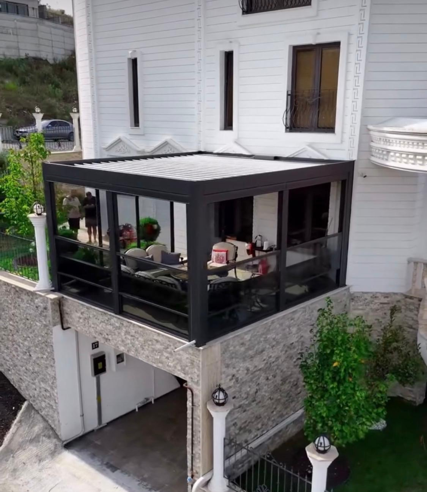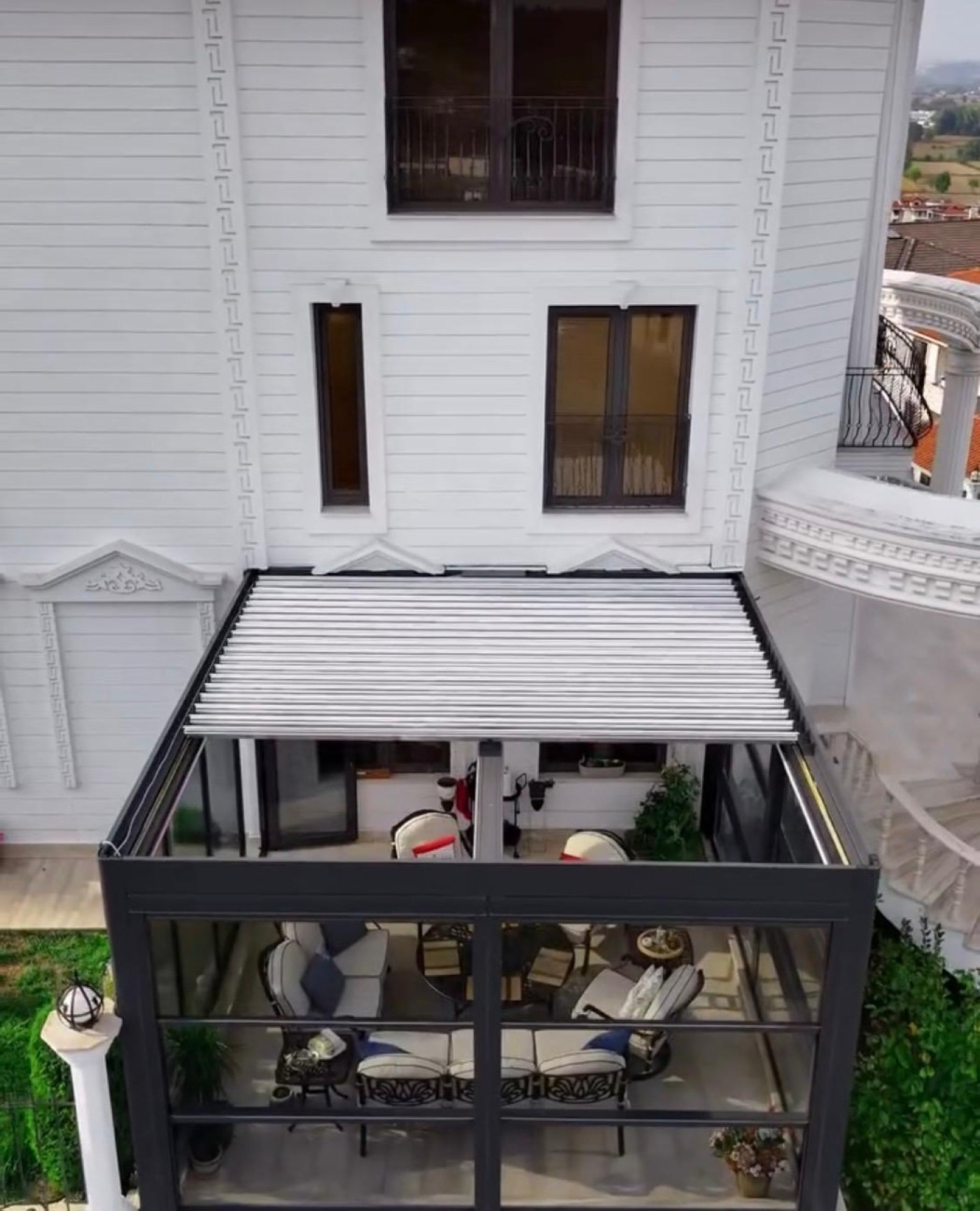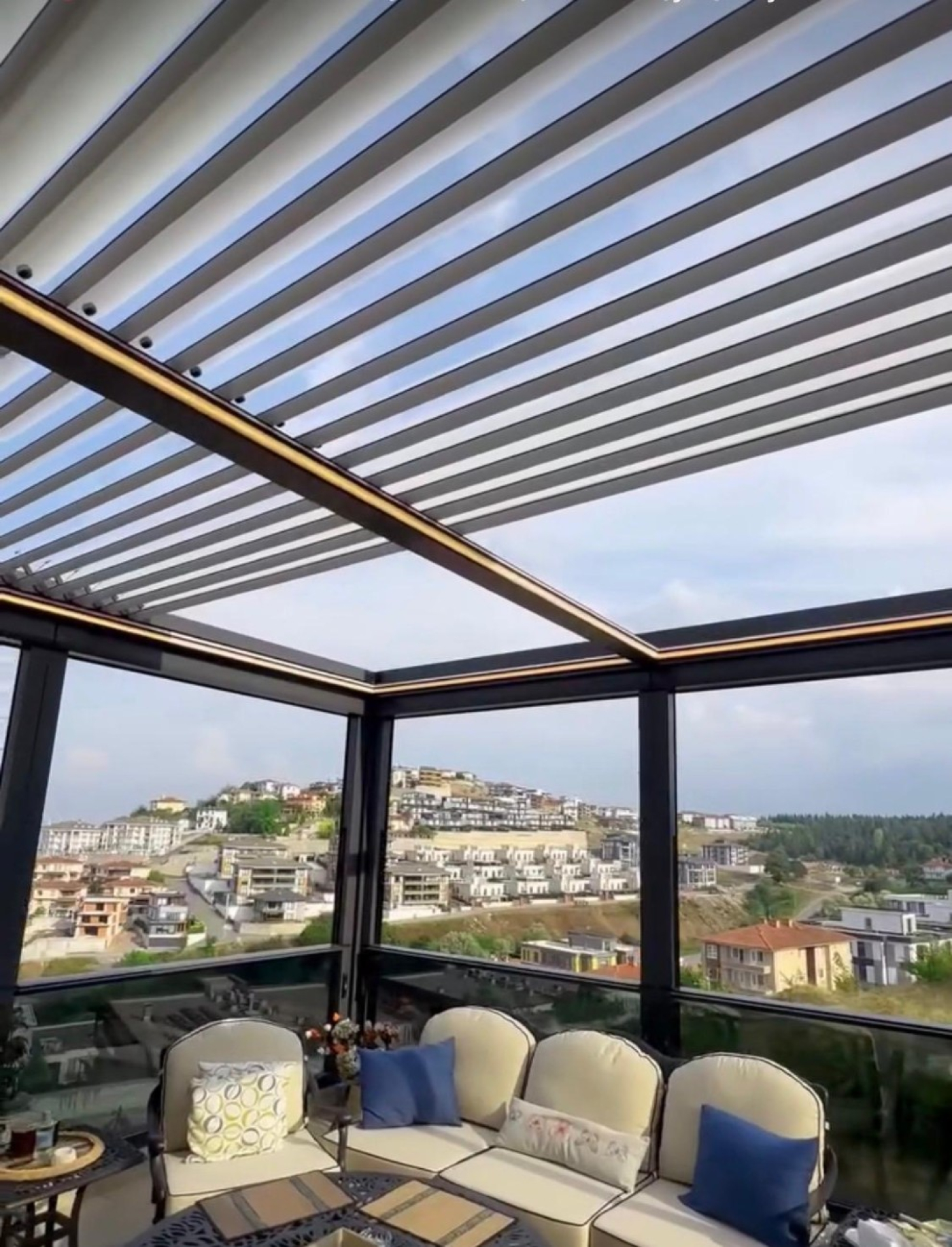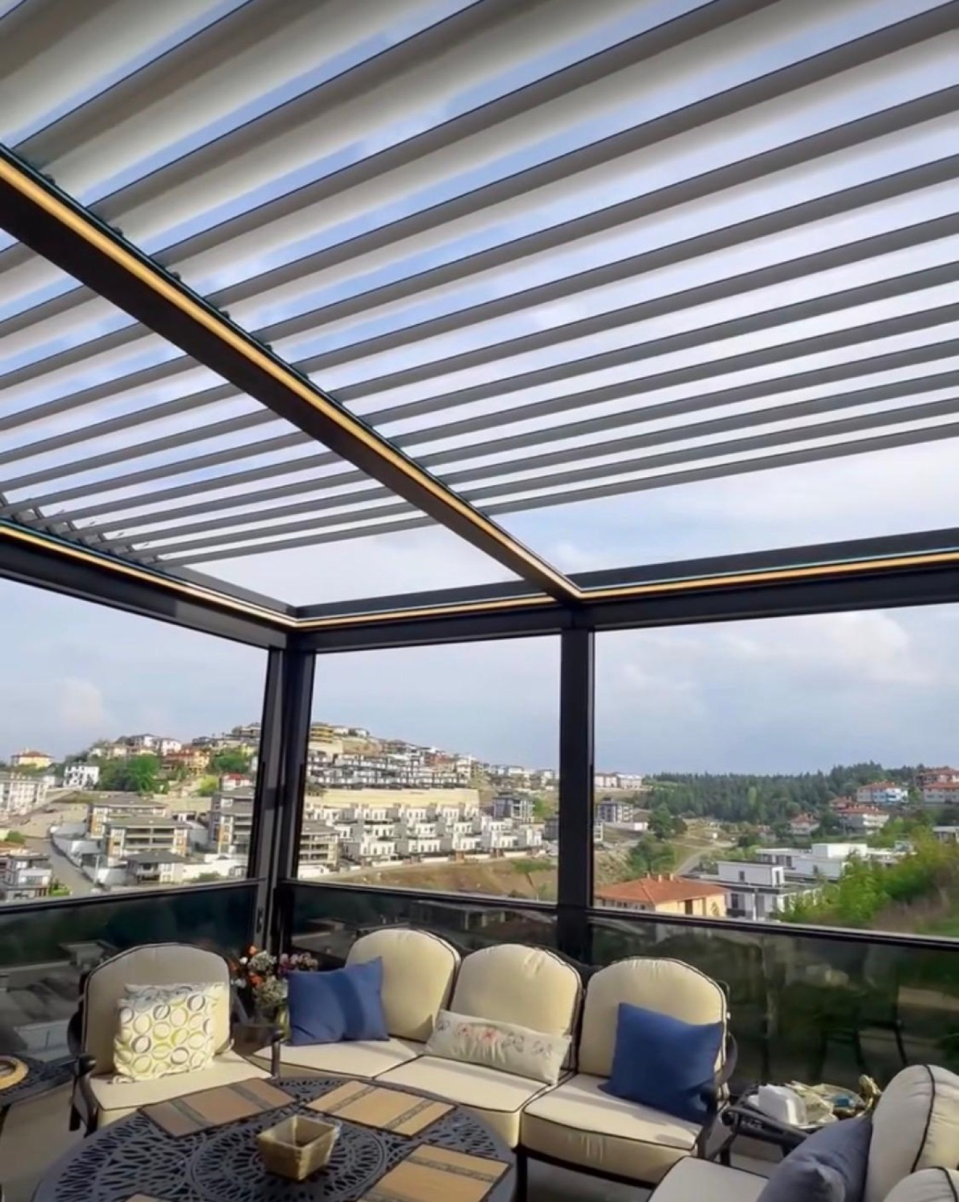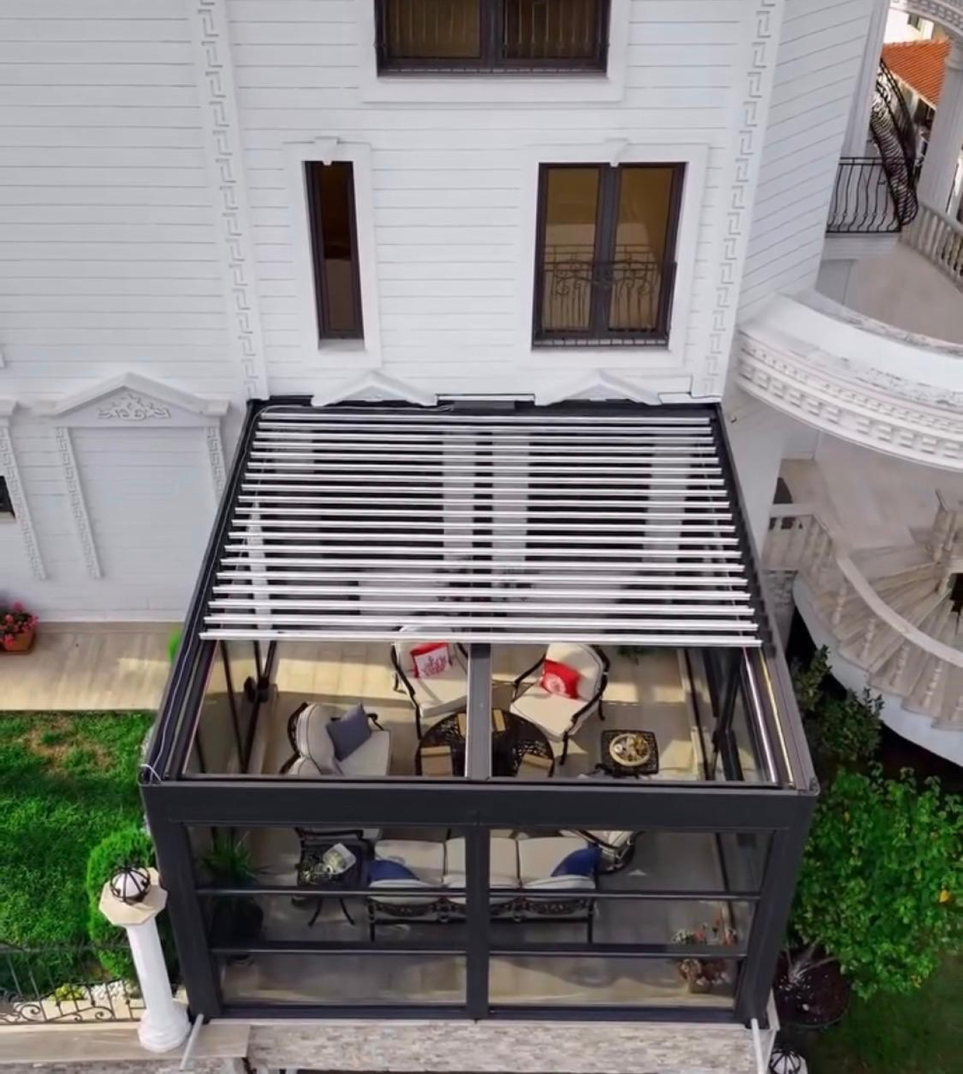 Bioklimatik pergola, açılır–kapanır alüminyum lamel yapısı sayesinde güneş ışığını, gölgeyi ve hava sirkülasyonunu tam kontrol altına almanızı sağlar. Yağışlı havalarda tamamen kapanarak yüksek koruma sunarken, güçlü altyapısı ve su tahliye sistemleriyle her koşulda sorunsuz kullanım sağlar.